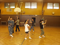 今日は黒石よされ節。昨日とはかなり踊りの傾向が違うので皆楽しんでくれるかどうか心配。昨日の顔ぶれが集まってきてくれた。それに予想もしていなかった懐かしいショーンとメリーが参加してくれた。二人はサンノゼ太鼓の25周年記念コンサートで一緒にステージをふんだ人たちである。ショーンは私の創ったパートの最初の踊りを踊ってもらった人。踊りは順調に覚えてくれたのでこの日は様々な構成に挑戦してもらった。2重の輪が入れ替わったり、外側の踊りが流し踊りをしている時に内側は回り踊りをしたり、その反対と交互に踊り方を変えたり。そして何よりも皆が心からこの踊りを納得する瞬間は、踊りの中に出てくる稲穂が揺れる振りです。その振りを抜き出してその振りだけを続けるのです。稲穂になった皆が時には緩やかに時には激しく風に揺れる。私は風の音を口と体で表して皆のイメージをかきたてます。何ともいえぬ稽古場の空気が凝縮していく瞬間が生まれるのです。皆も覚えると言う大変な作業から一瞬開放されて、感じる世界へ身をゆだねることで何ともいえぬ感動が全体を包みます。限りなく続くライス・フィールド(田んぼ)が確かにそこにうまれて・・・。