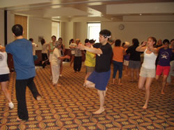 昨日と同じ会場で50人ほどの人が参加。ポートランド太鼓のザックが見学に来てくれた。でも「見学はダメ、踊って」というと素直に踊りに加わってくれた。ところがドイツ系で長身のザックが意外と上手い。私も意外な発見をした気持ち。この日はタイラーもアシスタントとして参加してくれた。アシスタントはミッシェルと徹君、そしてタイラーと3人になった。大助かりであった。3人の連携プレーも時間がたつに連れて工夫が進み、タイラーが音楽に合わせて太鼓を叩き始めると今度は徹君が交代して叩いたりと以心伝心の内にタイミングを見計らって適材適所の関わり方をしてくれた。