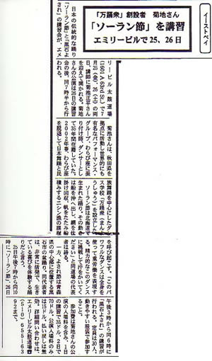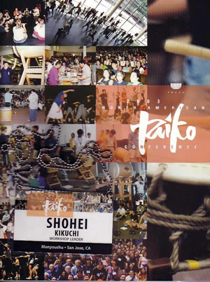 左は太鼓コンフェレンスの全日程と太鼓グループの紹介、ワークショップリーダーが記載されているノートの表紙とネームプレート 右は北米毎日新聞に掲載された記事