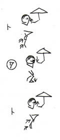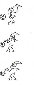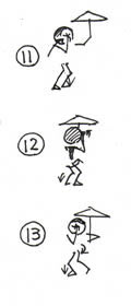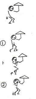 まず肩幅くらいに足をひらきます。 @左足を前に踏み出します。その時右手で腿を打ちます。 A右足の先の部分を地面にトンとつきます。 |