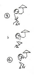 Jで手を顔の前に持っていきながら進行方向を向きます。 Kで左方向を向きJでそろえた左足をやや左後方につきます。 Lはその逆。 そして@に戻り繰り返します。 |