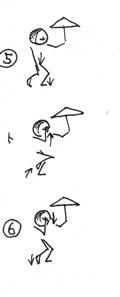 Gでその左足を着地させます。 Hで後ろを振り返りながら握った右手で指します。 Iでもう一度くりかえして指します。 |