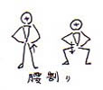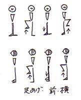 それまでに私が外国人に踊りを教えた経験から感じていたことは、生活様式のまったく違う外国人が日本の民舞を踊るとき一番苦労するのが重心を落とすこと、でしたのでそれを解決しないと始まらないということでした。単純に日本の文化に触れて楽しむ、とかいうのなら一つの経験としてエンジョイしてもらえばいいのでそんなことはやかましく言うことはない時もあるけれど、彼女は本物を吸収しようという固い心構えだったのです。まずは最初が肝心なので最も基本的な腰割から取り組み始めました。腰割の訓練とは図のように肩幅よりやや広めに開いて立った状態から腰を落としていき、太腿が膝と平行の位置になった所でストップさせ、それから元の腰の高さに戻す、その単純な動作の繰り返しの訓練のことを言います。