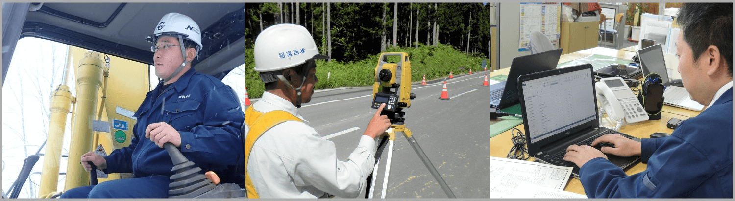 ㈱西宮組は、ダムや河川、道路、橋、上下水道、建物などのインフラ整備など、さまざまな建設工事を行う企業です。地域住民の生活基盤となるものをゼロからつくりあげ、さらには近年多発している自然災害による復旧工事などでは、安心して日常生活を再開させるなどの社会貢献に大きな役割を担っております。また、同じ企業の中でも、構造物や建物を設計する人や工事現場を監督する人、営業して工事を受注してくる人、専門作業を行う職人、給油職など多様な職種の職員が多数勤務しております。自身の希望する業務や、思い描くキャリアプランに応じて、多くの活躍の場があります。