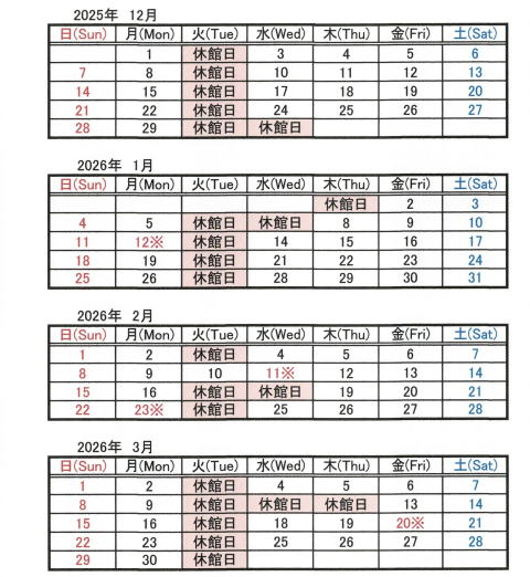 誠に勝手ながら、2025年12月から2026年3月まで下記の日にちを休館日といたします。